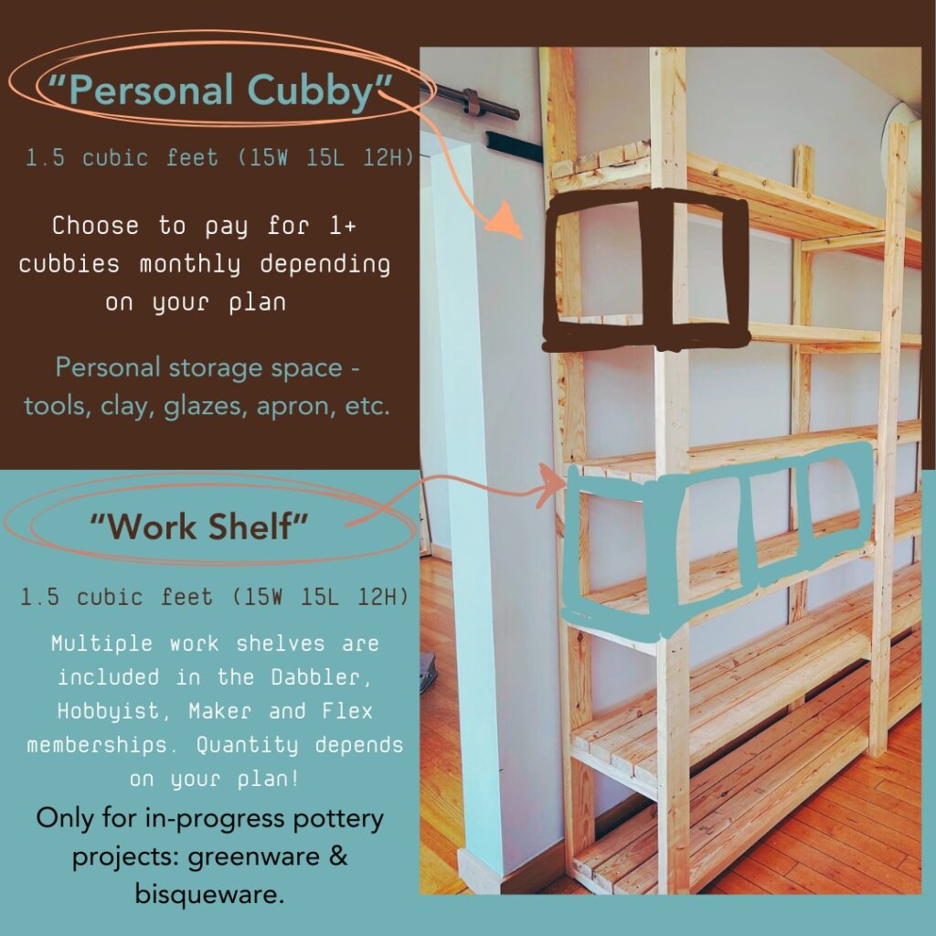 - Maker membership includes a larger cubby (18 × 15 × 15)